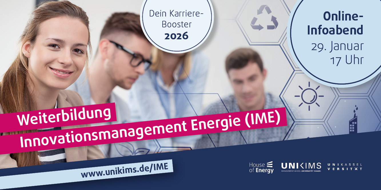 In Zusammenarbeit bieten das House of Energy und die Universität Kassel das dreimonatige berufsbegleitende Zertifikatsprogramm Innovationsmanagement Energie (IME) an. Dieses startet im April 2026.